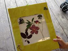 キッズパークで育ったお花や葉っぱを押し花にしました。