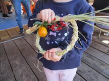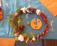 キッズパークの木の枝やつるをつかってリースにして、園内のどんぐりやふうせんかずら、千日紅などの植物で彩りました。子どもたちが自由に考えて形にしていき、かわいいリースがたくさんできあがりました!