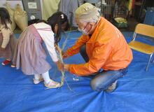 キッズパークの田んぼで収穫したわらを使ってしめ縄作りを行いました。わらをたたいて編むところから始めました!