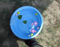 桶にキッズパークに咲いているお花をうかべたり、カップにいれて遊んだり、お水ならではの遊びが広がりました。