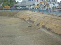 - およそ2メートル掘削。湧水があるのが分かります。中央運動公園の敷地内からは湧水が多く発生しますので、それを排水しながらの調査となります
