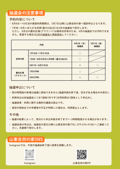 - 抽選会後の申込は、抽選会の翌日以降に山東自然の家(079-676-4100)へご連絡ください。