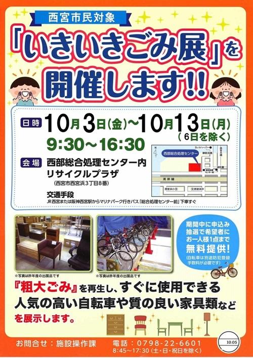 西部総合処理センターに搬入された、粗大ゴミを修理再生し、西宮市民の皆様に無償で提供、再利用して頂く、エコでクリーンな催し「いきいきごみ展」をリサイクルプラザにて、開催いたします。人気の高い自転車、質の良い家具類などを展示いたします。