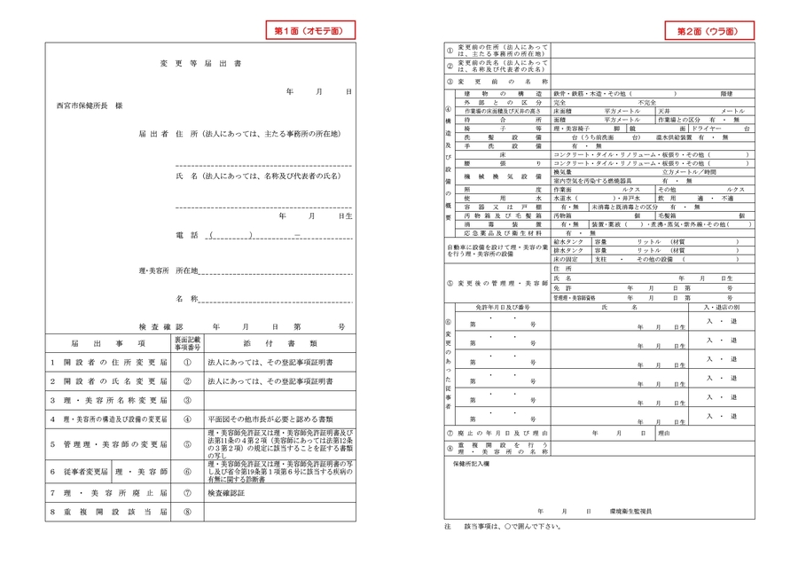 - 第1面に届出者情報、理・美容所情報(名称は変更後のもの)及び検査確認番号等、必要事項を記入してください。