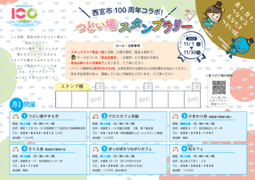 お近くのスタンプラリー参加つどい場は「にしま~れ(西宮市社会資源情報サイト)(外部サイト)新規ウインドウで開きます。」で検索!