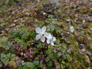 北山山荘の奥の山野草のお庭では、バイカオウレンが咲き始めました。