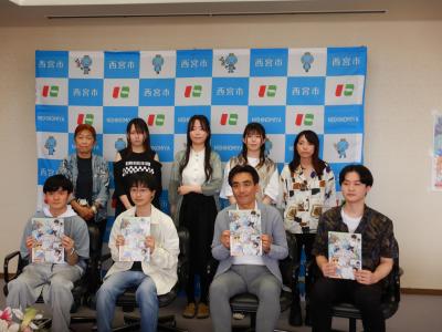 2022年6月16日、今回のマンガ制作に携わった学生7名と佐藤教授が西宮市長を表敬訪問し、冊子の完成を報告しました。当日、学生たちは、制作にあたりこだわった点や苦労した点、今回の連携を通じての自身の意識の変化などを市長に伝えました。