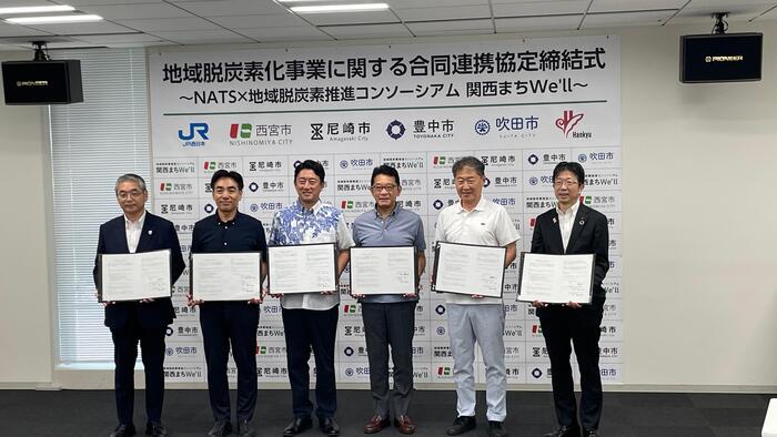 協定の締結にあたり、令和3年に地球温暖化問題の解決に向けた連携に関する基本協定を締結したNATS ※各市(西宮市・尼崎市・豊中市・吹田市)については、首長などが一堂に会し、7月30日に合同で協定締結式を開催しました。