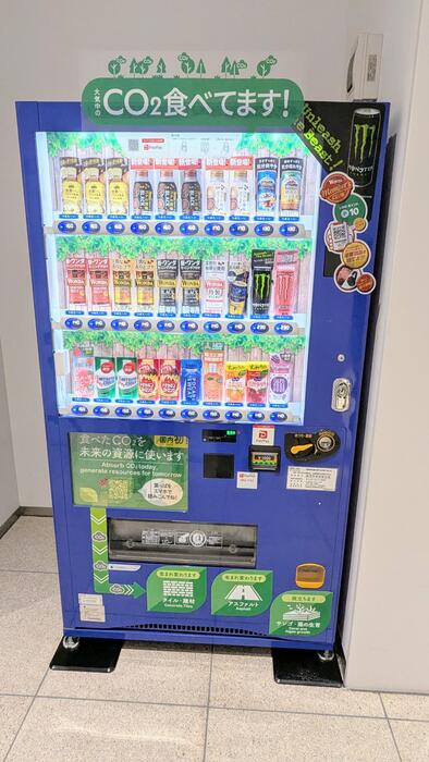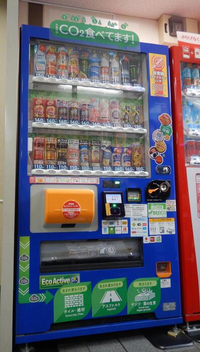 「CO2を食べる自動販売機」は、アサヒ飲料株式会社が開発した自動販売機庫内にCO2を吸収する特殊材を搭載した自動販売機です。