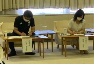 協定にサインする様子(左:西宮市長、右:尼崎市長)
