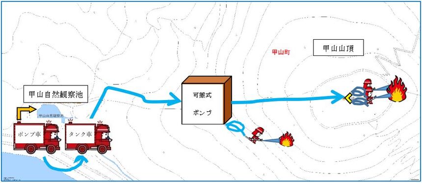 甲山山頂付近から火災が発生した想定で、甲山自然観察池から取水し消防車、可搬式ポンプを用いて送水を実施。