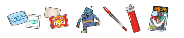 - 保冷剤、カイロ、花火(水で濡らす)、金属の混ざったプラスチック製のおもちゃ、文房具、ライターなど