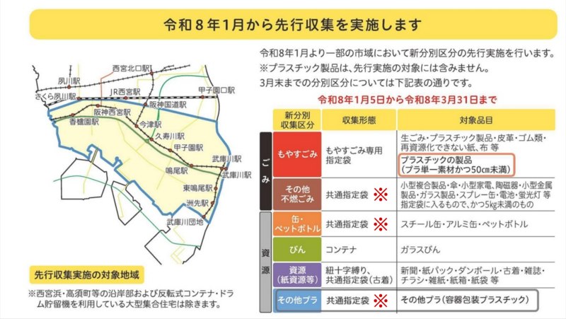 - 新破砕選別施設の試験運転も兼ねて、令和8年1月より一部の市域において新分別区分の先行実施を行います。