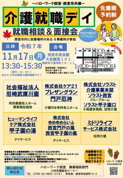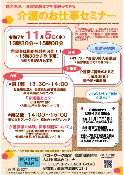 ハローワーク西宮と西宮市は、介護の仕事に就きたい人を対象とした介護職セミナー・就職相談&面接会を開催します。
