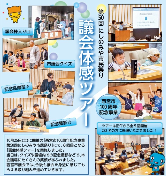 西宮市議会は、にしのみや市民祭り(10月25日)にて8回目の「議会体感ツアー」を開催。ツアーは正午から全5回実施し、計232名の方にご参加いただきました。