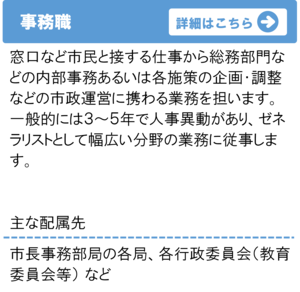 以下の職種名をクリックいただくと、職種ごとの詳細ページが開きます。※本ページでは、現在、一部職種のみ掲載しております。